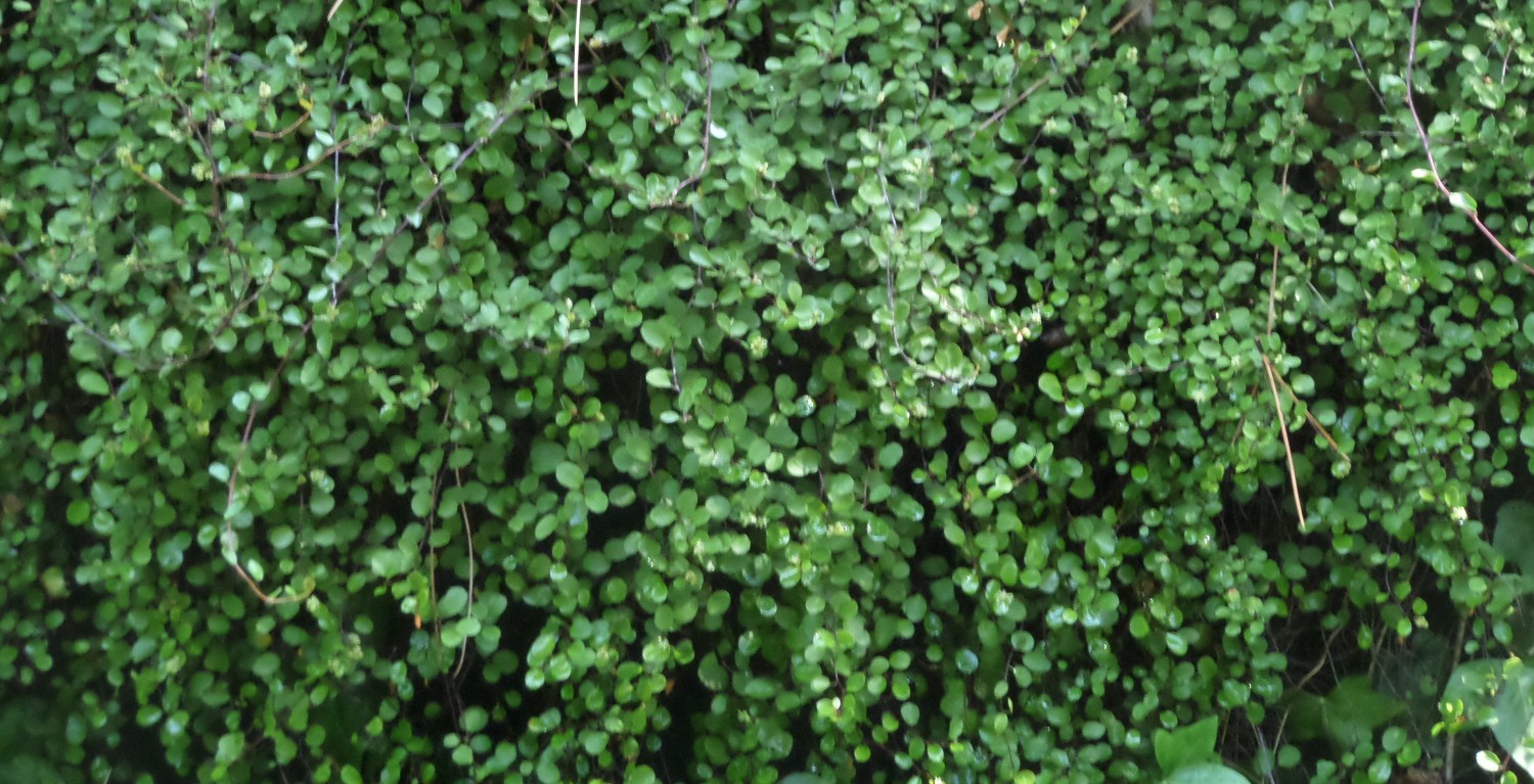 Características: Enredadera densa. Tallos púrpura oscuros y finos, hojas verdes broncíneas y diminutas, flores blancas en primavera.