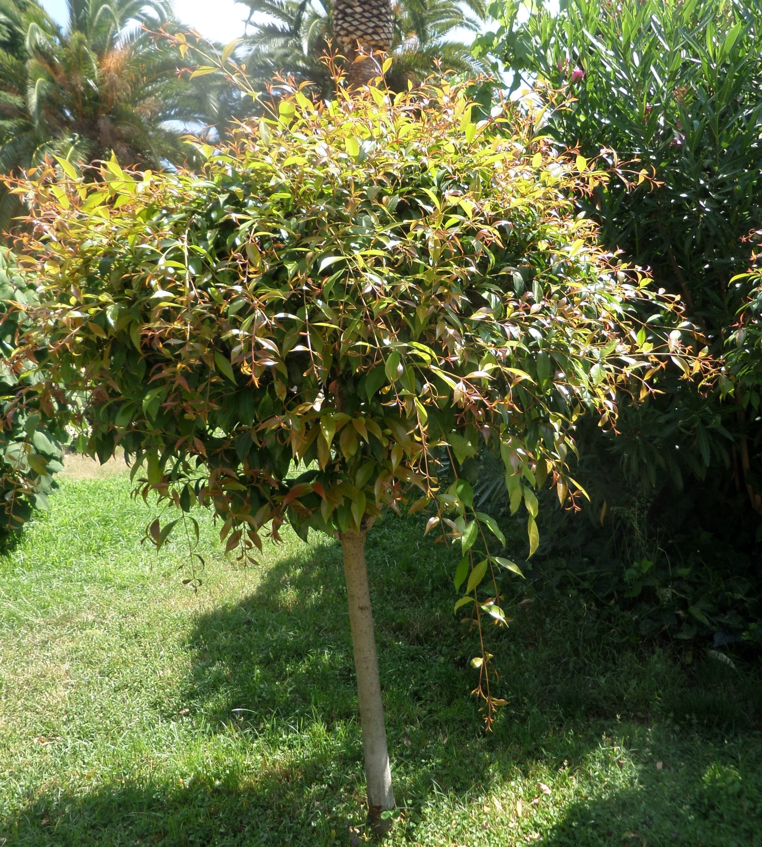 Características: Hasta 8m de alto. Follaje denso, hojas de oblongas a lanceoladas, verde oscuro y lustroso, pardo cobrizo las jóvenes. Flores plumosas, crema, en verano. Bayas púrpura carmín.