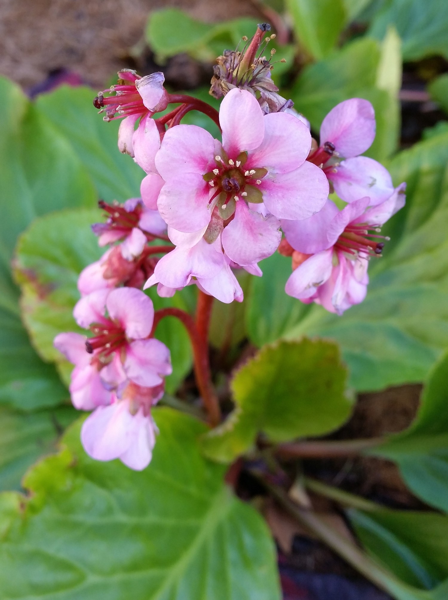 - Inglés: Early bergenia, Syberian tea, pigsqueak, Korean elephant-ear, badan, Mongolian tea, leather bergenia, winter-blooming bergenia, heartleaf bergenia, elephant-ears, heart-leaved bergenia, elephant’s ears.