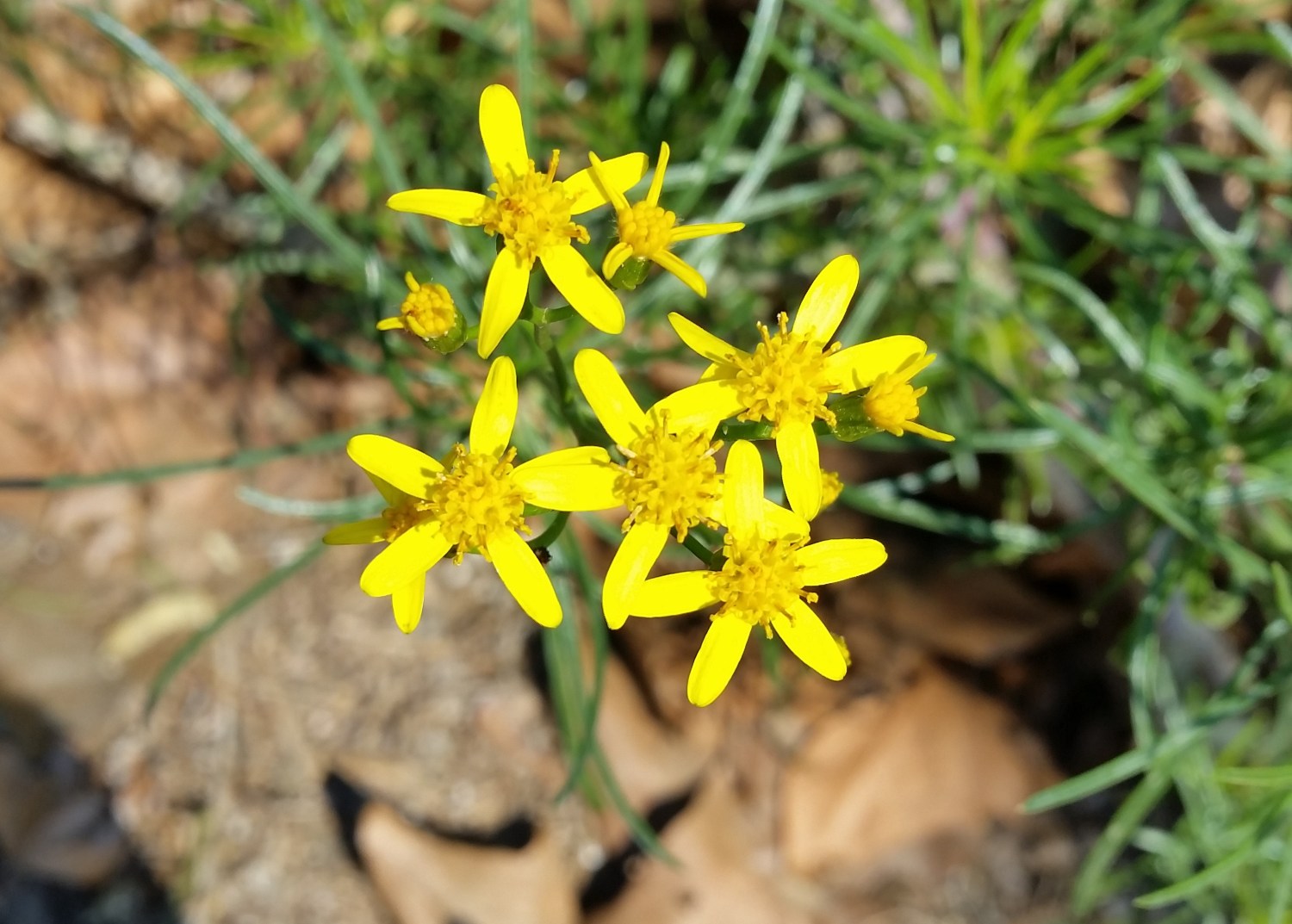 Arbusto de hasta 3m de altura. Hojas alternas a lo largo de las ramas y radiales en el ápice de estas, aciculares de unos 4 cm de largo. Inflorescencias con flores amarillas e involucro con brácteas iguales y dispuestas en una fila. Las flores radiales son femeninas, mientras que las del disco son hermafroditas. Florece en primavera y en otoño en una segunda floración (por este motivo nuestro ejemplar carece casi de flores). Fruto en aquenio más o menos redondeado y acostillado.