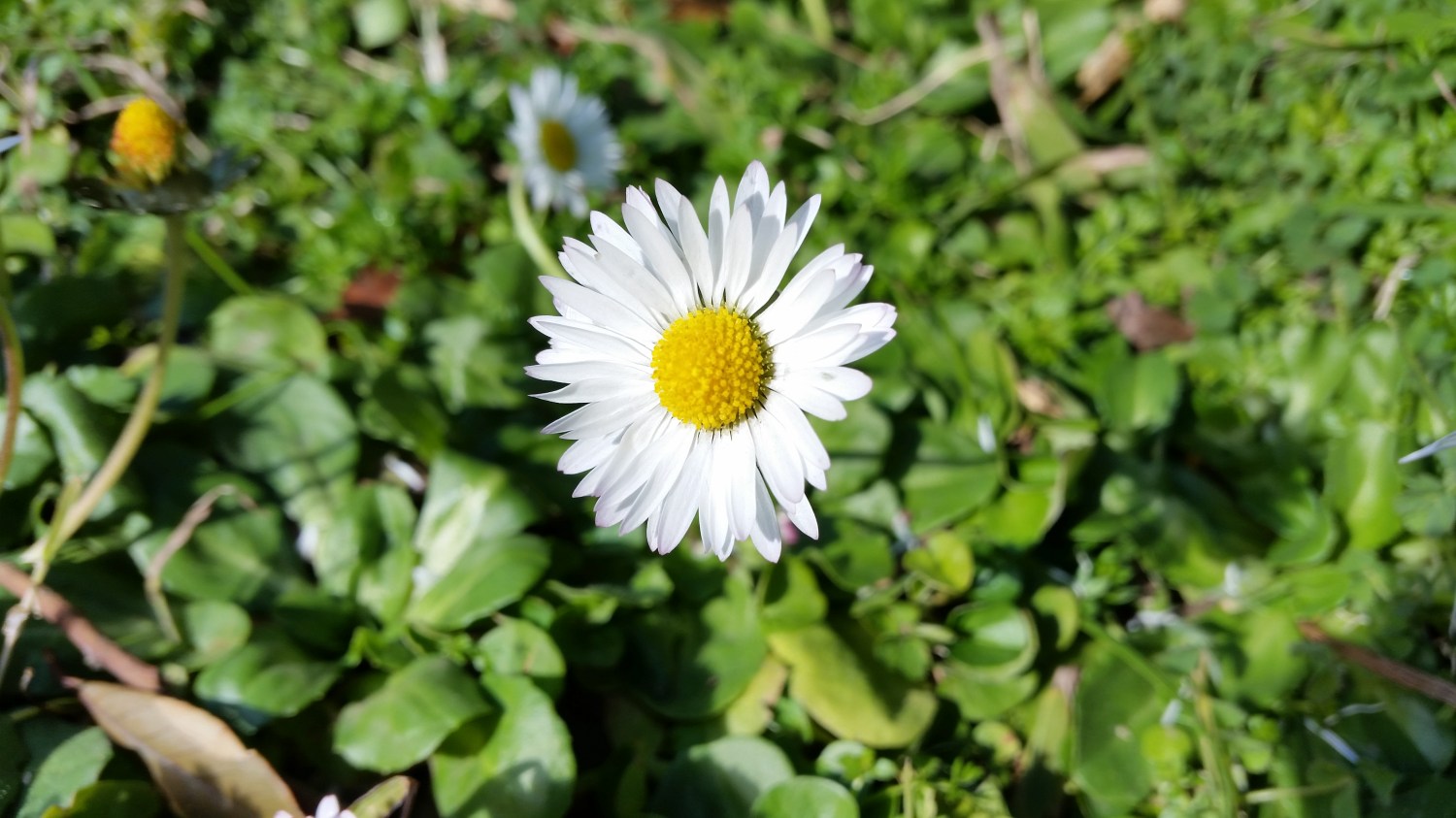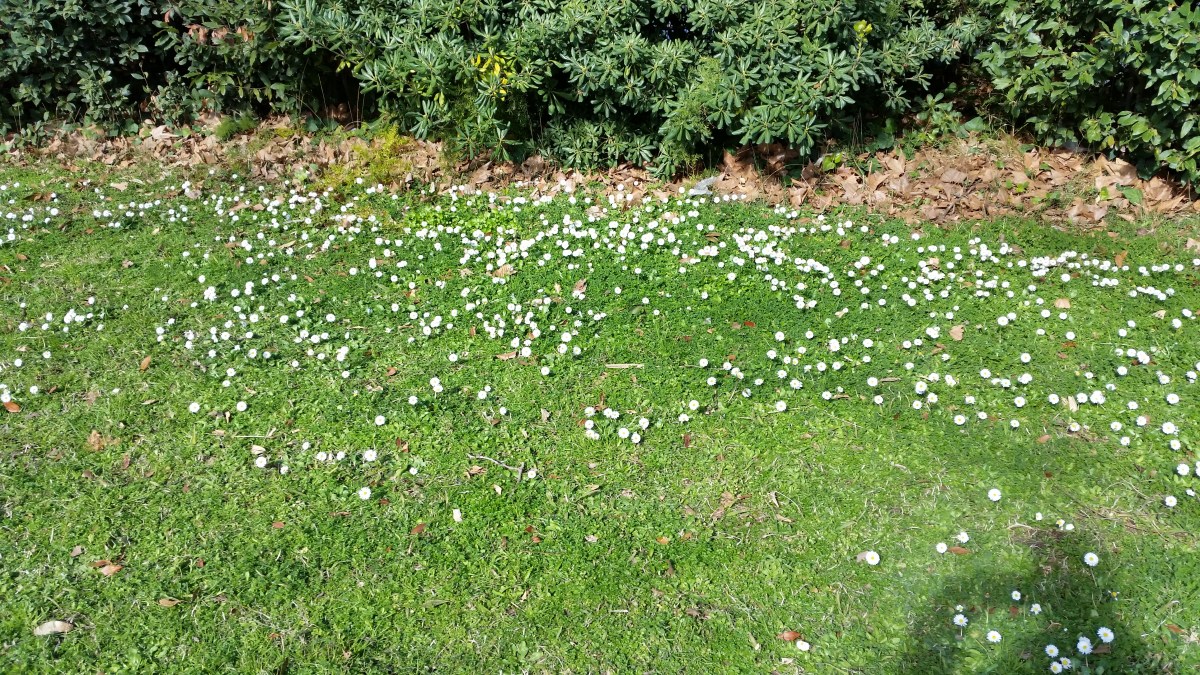 Las alturas de corte altas permiten respetar la floración de especies como la margarita (Bellis perennis), «margaridoia» en catalán , como aparece en las imágenes, de porte bajo y muy interesante por su floración rica en néctar y polen, muy usada en céspedes por su valor decorativo y resistencia a la siega.