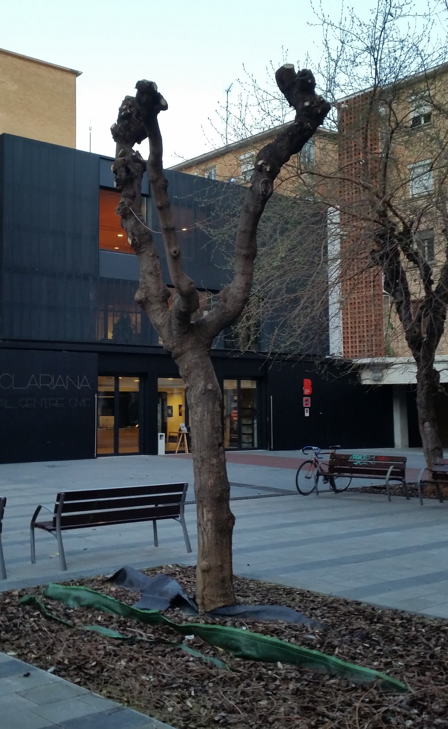 - Parece una poda de reestructuración solo en este único árbol, seguramente presentaba unos brazos de palanca largos, con podredumbre y riesgo de caída a los bancos de debajo, estéticamente no gustará lógicamente, pero la respuesta del árbol suele ser buena, los ejemplares de atrás seguramente se reformaron años atrás. Los cortes están bastante correctos, en ángulo y punto de corte. No hay que confundir un desmoche con una poda de reestructuración.