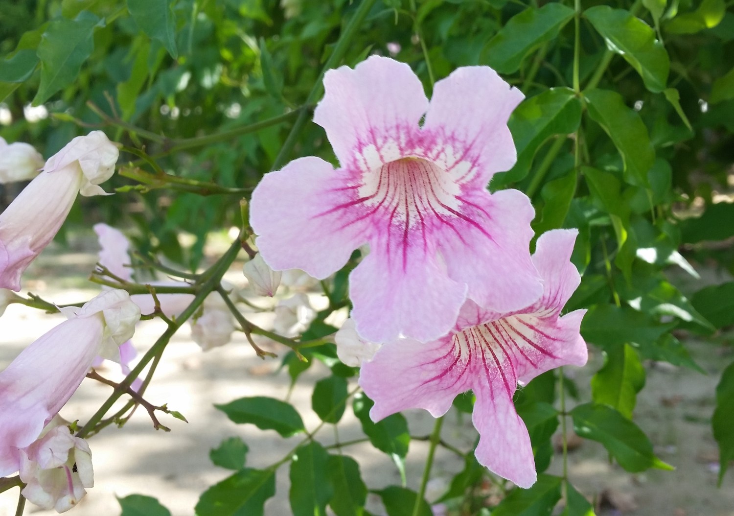 Características: Planta trepadora de crecimiento rápido. Hojas compuestas con 5-11 folíolos verdes. Grupos laxos de flores rosa con bandas rojas, fragantes y en forma de embudo, un poco parecidas a las de xChitalpa tashkentensis (especie que traté anteriormente). Florece de primavera a verano, aunque las fotografías fueron tomadas el 22 de septiembre, rozando ya el otoño.