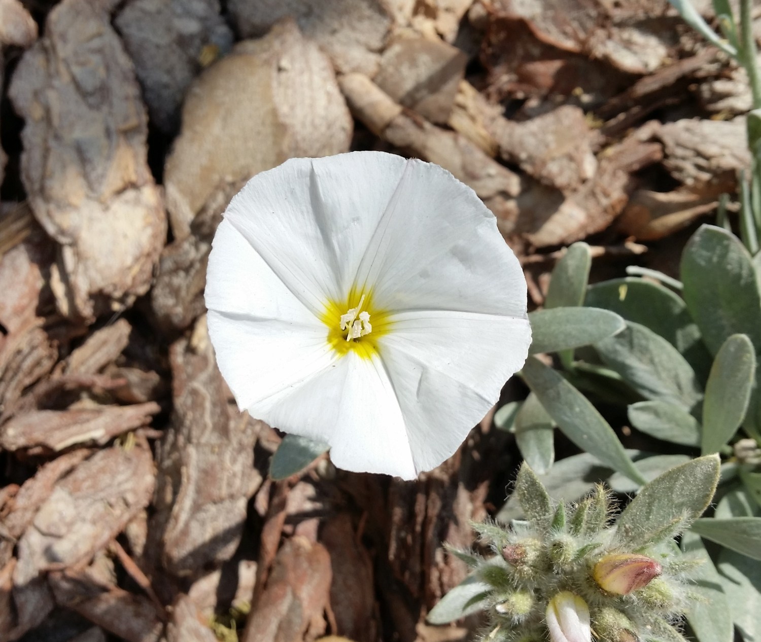 Características: Planta vivaz de hoja perenne de hasta 60cm de altura en forma de moño con tallos densos y débiles. Hojas plateadas o verde plateadas, finas, estrechas sedosas y pilosas. Flores abundantes, embudadas, de color blanco. Florece de primavera a verano.