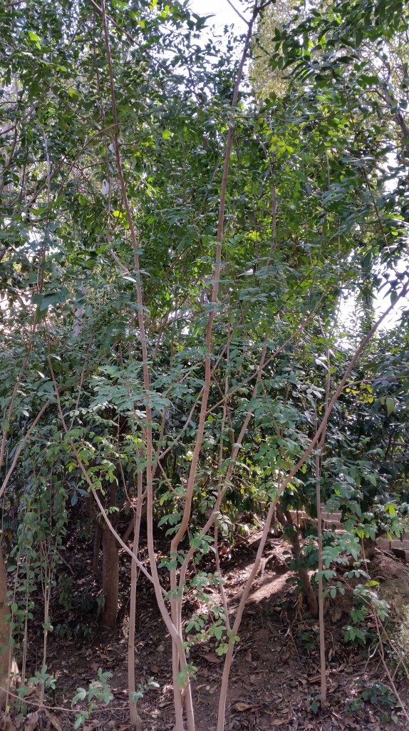 Características: Arbol perennifolio de hasta 6m de altura. Hojas esparsas, simples, onduladas, correosas, bipinnadas, con envés claro y margen espinoso, cubiertas de finos pelos cuando son jóvenes. Capullos verde pálido que dan pequeñas flores con 4 pétalos blancos. Fruto carnoso rojo brillante en forma de baya. Florece de abril a julio.
