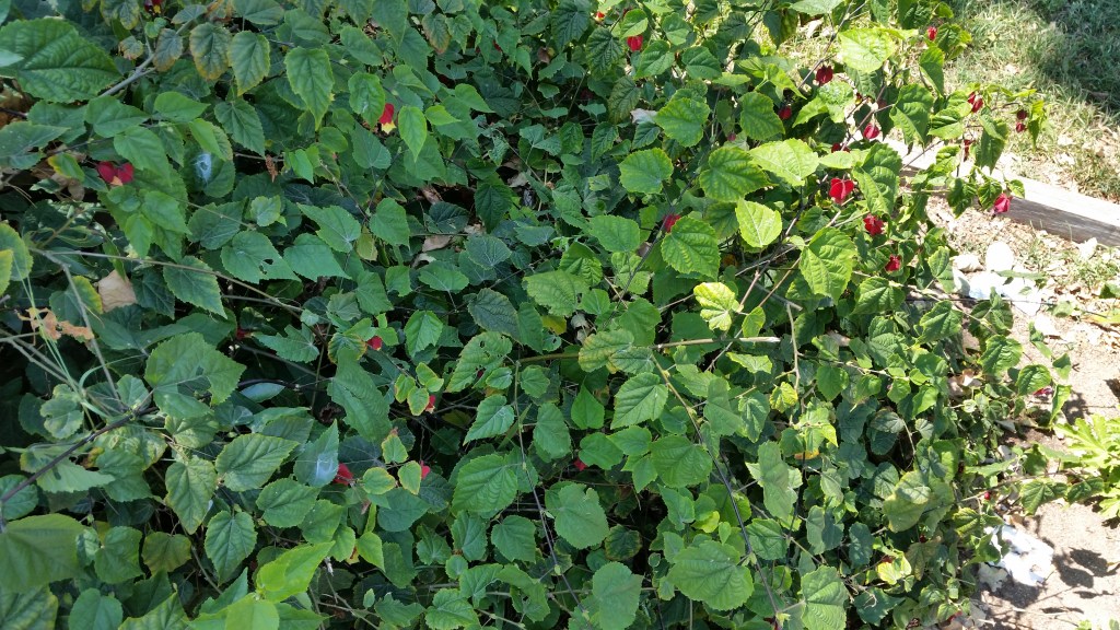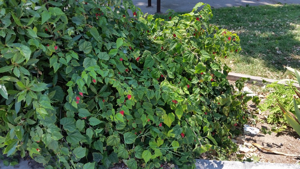 Características: Arbusto perennifolio erecto con ramas arqueadas o casi postrado, más o menos trepador, de hasta 2,5m de altura. Hojas dispersas y simples en forma de corazón. Flores radiales en forma de campana con el cáliz rojo y pétalos amarillo pálido. Florece des de julio a octubre.