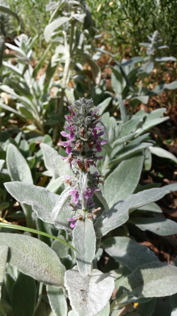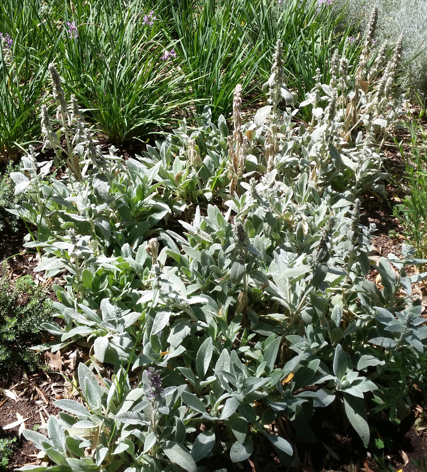 Características: Planta perenne, rastrera, rizomatosa y tapizante de hasta 45 cm de altura. Hojas oblongas a elípticas verde grisáceo con un vello blanco plateado, lanoso, agradable al tacto. Tallos erectos y ramificados de flores púrpura a finales de primavera-principios de verano.