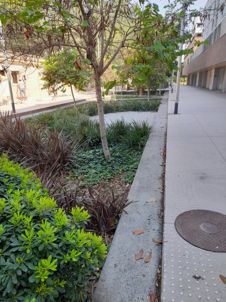 Se han establecido áreas de biorretención en la lima-olla de la calle que gracias a su forma cóncava permiten retener la escorrentía en los momentos pico y el consiguiente tratamiento de contaminantes procedentes de calzada a través de la detención y biodegradación de metales pesados e hidrocarburos