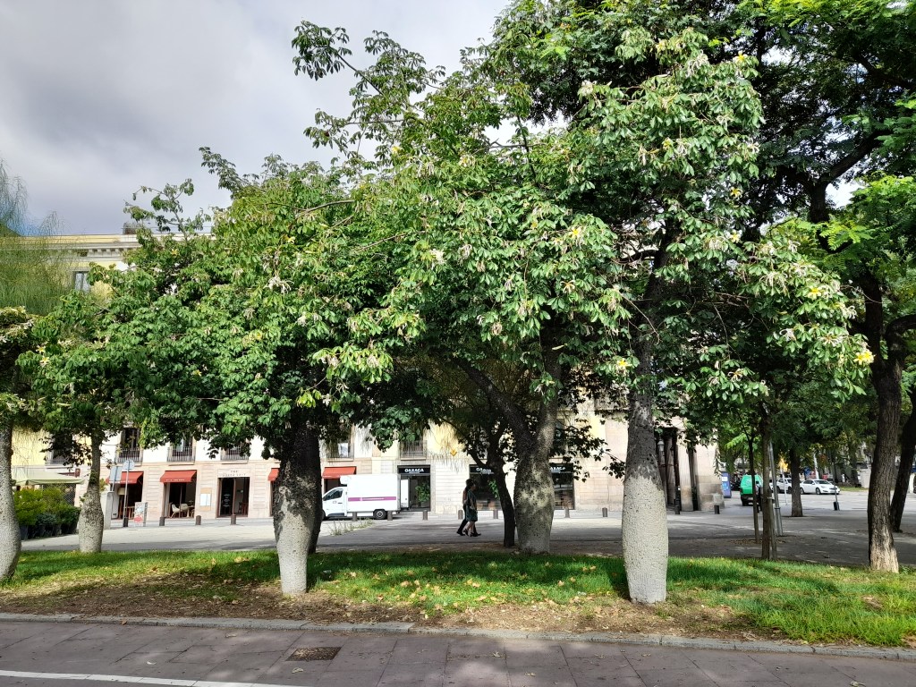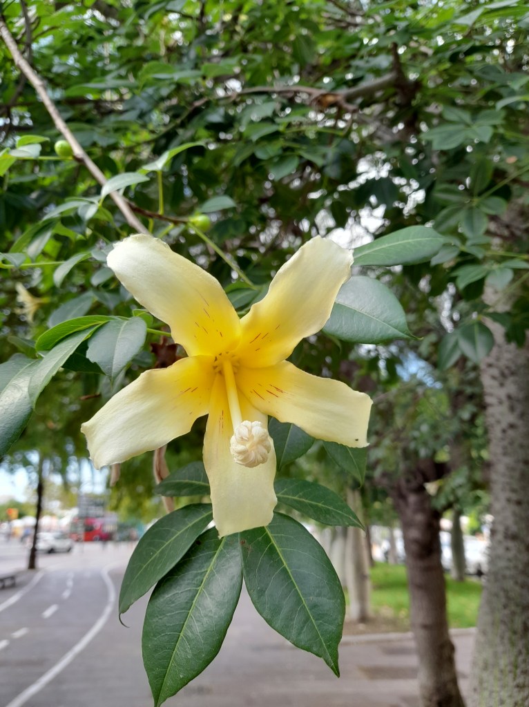 Características: Árbol de hoja caduca de hasta 20m de altura. Tronco hinchado, liso de joven y agrietado en la madurez, grisáceo con estrías verdosas y cubierto de robustas espinas cónicas. Hojas palmeadas, con 5 foliolos de borde aserrado y un largo peciolo. Espectacular floración entre verano y otoño. Flores grandes con forma de embudo y con pétalos de color amarillo vainilla. El fruto es una cápsula con 5 valvas que al abrirse dejan libres unas fibras lanosas como algodón que se usan para rellenar almohadones.