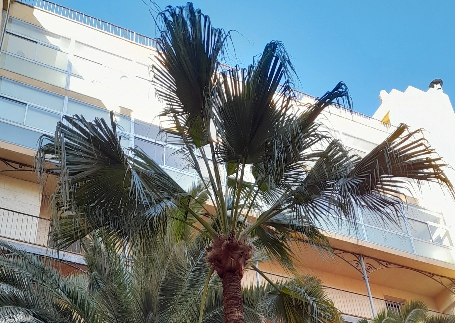 Características: Palmera en abanico de hasta 15m de alto con un tronco anillado, fisurado y marrón que se vuelve gris al madurar. Frondas verdes brillantes y grandes, colgantes, muy divididas en segmentos de punta dividida, péndulos, a modo de girones dispuestos en radio en muchos planos y pecíolos muy armados de espinas. Pequeñas flores amarillas, en primavera. Fruto globular y brillante, negro al madurar.