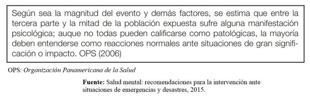 Para comprender la afectación del bienestar tras un desastre natural, la reducción significativa de recursos causada por el evento alteraría la interacción entre la persona y su entorno, lo que sin duda influirá sobre las dimensiones del bienestar psicológico y la capacidad de afrontamiento del individuo. Por lo general, es frecuente que la exposición a estos eventos traumáticos provoque en las personas una disminución en la autoestima y sentido de identidad, incapacidad para adquirir habilidades y destrezas de afrontamiento, valoración negativa de uno mismo y sentimientos de culpabilidad o falta de control, y la experimentación de dificultades en el establecimiento de relaciones con otros.